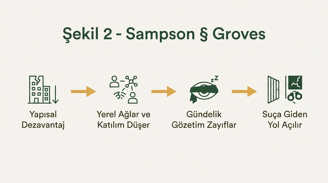 1950’lerden itibaren, resmi istatistiklerin yanında fail bildirim (self-report) anketleri ve mağdur bildirim anketleri gibi yöntemlerle elde edilen bilgiler, suçun aslında şehrin bütün bölgelerine ve farklı sosyal sınıflara yayılmış bir yapısı olduğunun fark edilmesini sağlamıştır. Bu noktada, Sampson ve Groves 1989 yılında yayımladıkları araştırmaları ile sosyal düzensizliğin doğrudan suça neden olmadığını, aslında geleneksel kontrol mekanizmalarının çöküşüne neden olduğunu, bu çöküşün de suça giden yolu açtığını iddia etmişlerdir[3]. Düşük ekonomik statü, yüksek nüfus hareketliliği, parçalanmış aile yapıları ve şehirleşme gibi etkenler yerel düzeydeki bağları koparır; çocukların ve ergen gruplarının yetişkinlerce yeterince gözetlenememesine, insanların birbirine yabancılaşmasına ve toplumsal faaliyetlere katılımın düşmesine yol açabilir. Sonuçta, suçun önündeki gündelik bariyerler zayıflar (Şekil 2).