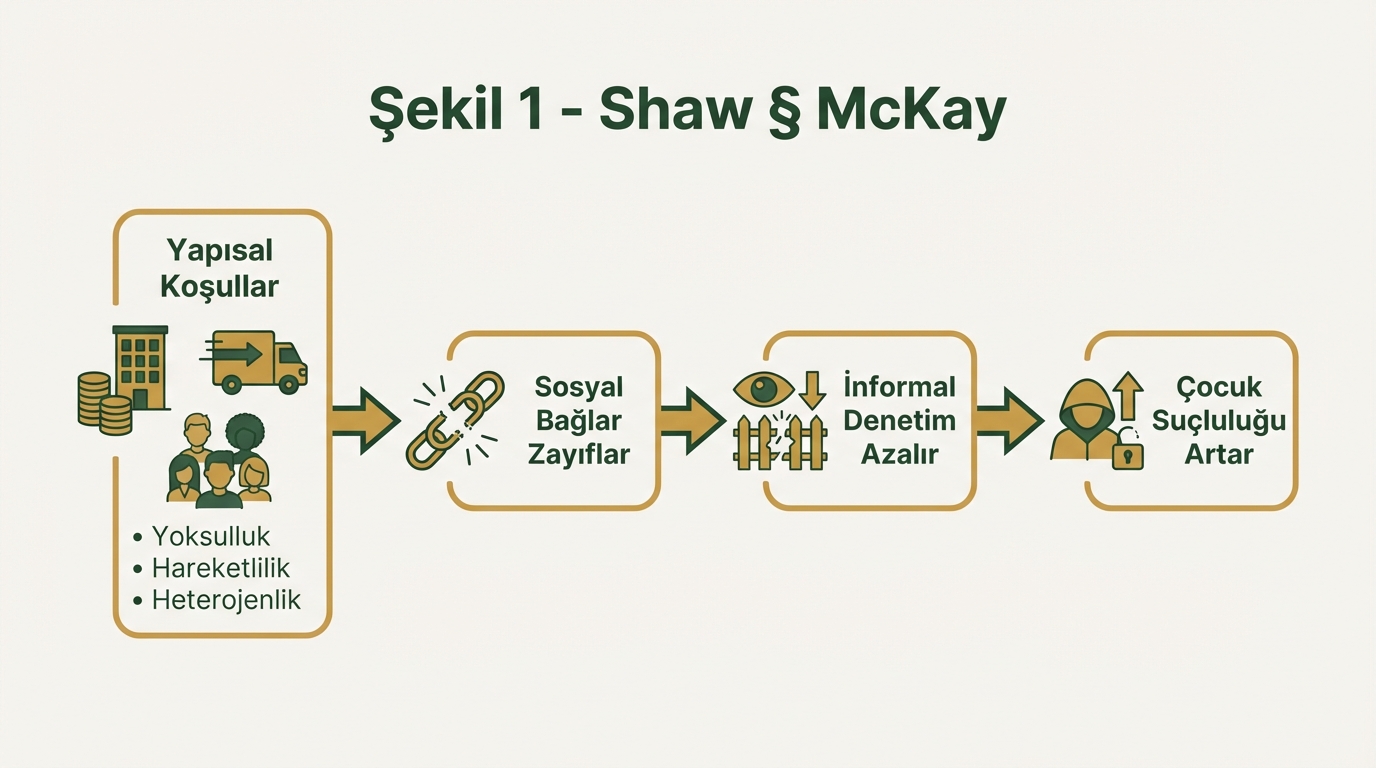 “Şikago Okulu” veya “Ekolojik Okul” olarak da anılan bu yaklaşım, Amerikalı kriminologlar Clifford Shaw ve Henry McKay’ın suç ve şehir arasındaki ilişkiyi inceledikleri ve ilk kez 1942 yılında yayımladıkları “Çocuk ve Gençlik Suçluluğu ve Şehir Bölgeleri” (Juvenile Delinquency and Urban Areas) adlı çalışmalarına dayanır[2]. Shaw ve McKay, ampirik çalışmalarında Şikago’da suçun bazı bölgelerde yoğunlaştığını; yoksulluk ve hızlı nüfus hareketleri gibi faktörlerin sosyal bağları zayıflatıp kurumların kapasitesinin aşındırarak bu bölgelerin daha fazla suç üretmesine neden olduğunu ortaya koymuşlardır.